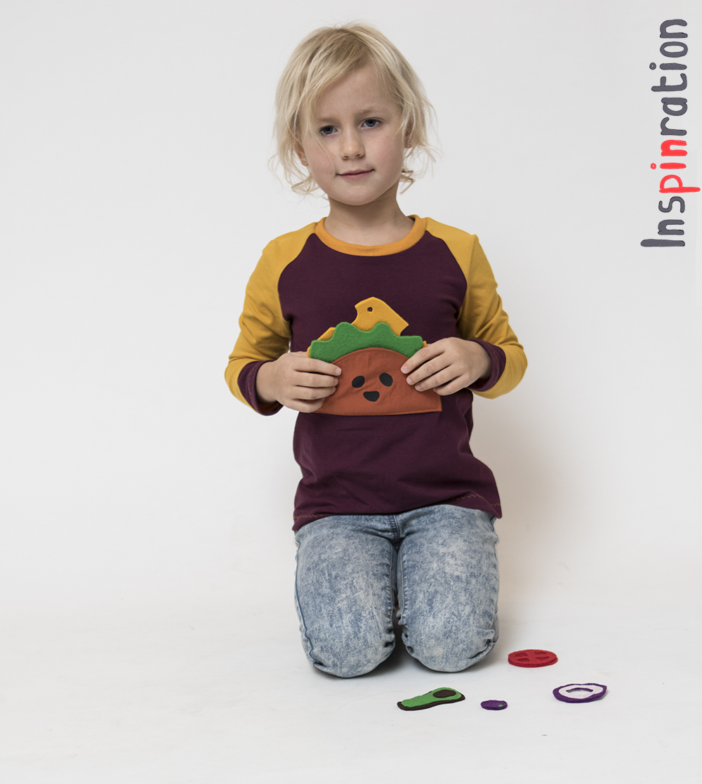 The project that inspired such praise was this interactive shirt. Yes, interactive, besides being a shirt it doubles as a toy. My middle daughter LOVES kitchen toys (besides the kilo's of Lego's in our house we have a lot of kitchen play sets as well), so when I saw this applique I immediately knew who I would use it for. Although the original project is an easy sew, I made it even easier. Officially you have to stabilize your fabric for the food item and sew the halves together. I went a slightlydifferent route, I saw this as the perfect opportunity to finally use the felt that I once bought. Besides the cheese, all the food items were made from inexpensive hobby felt that I glued together with textile glue. The cheese is from high quality felt and it is one layer. After cutting the union I decided to make an olive which is not in the set) from the little scrap circle.
